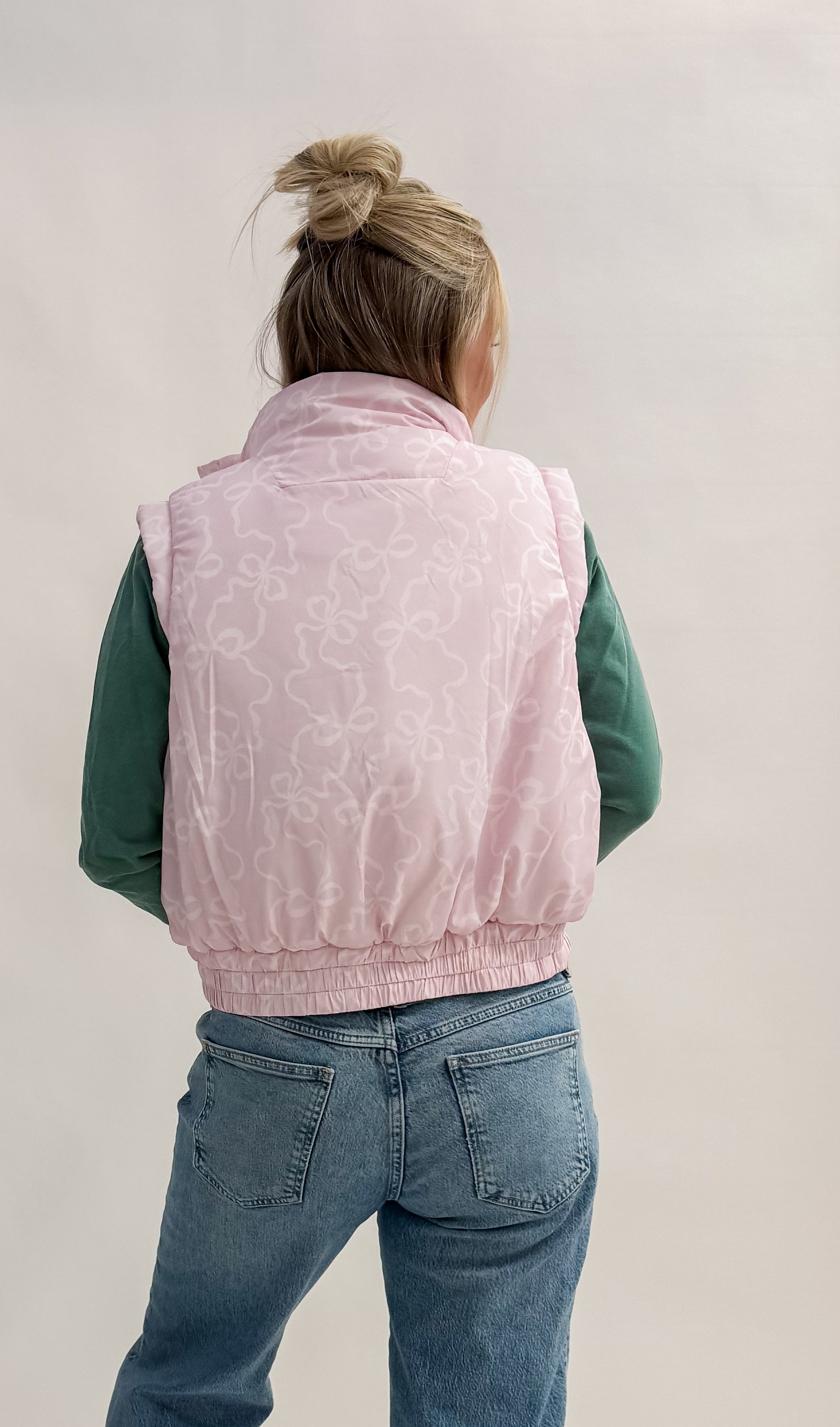 - Bow Print design adds a playful, feminine touch to a versatile puffer vest