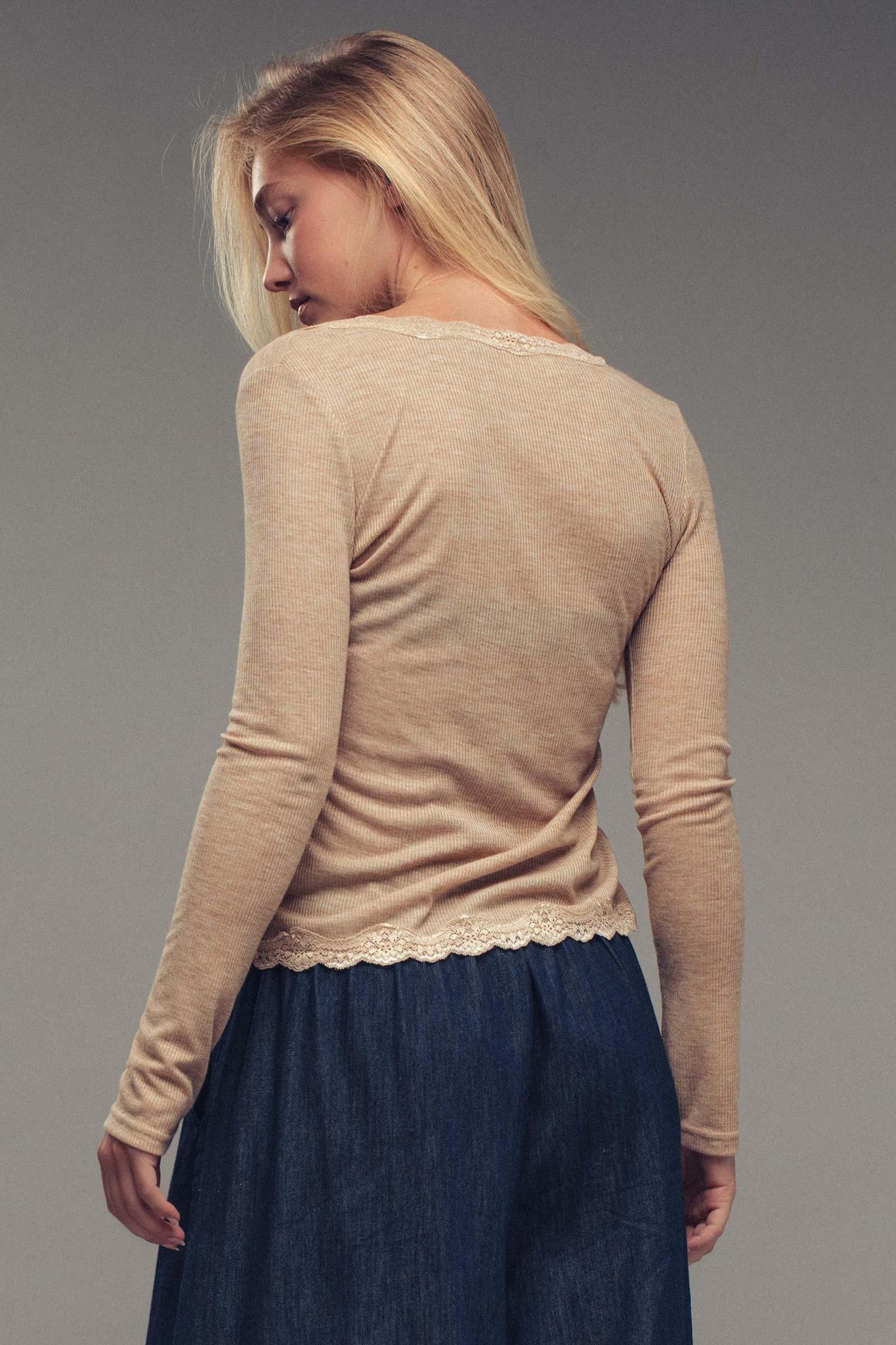 Crafted from a soft, breathable cotton-blend ribbed knit, it moves with you and keeps its shape thanks to added stretch. Delicate lace trim frames the neckline, while a flattering button-front design adds polish without fuss.